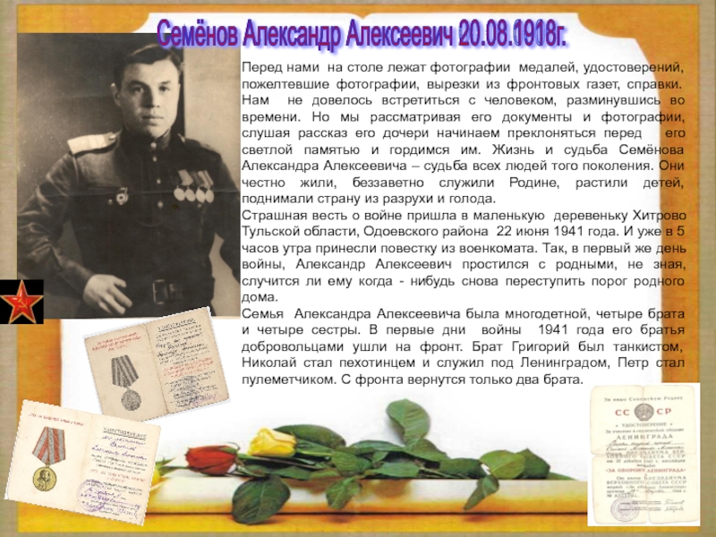 удостоверений, пожелтевшие фотографии, вырезки из фронтовых газет, справки. Нам не довелось встретиться с человеком, разминувшись во времени. Но мы рассматривая его документы и фотографии, слушая рассказ его дочери начинаем преклоняться перед его светлой памятью и гордимся им. Жизнь и судьба Семёнова Александра Алексеевича – судьба всех людей того поколения. Они честно жили, беззаветно служили Родине, растили детей, поднимали страну из разрухи и голода.
