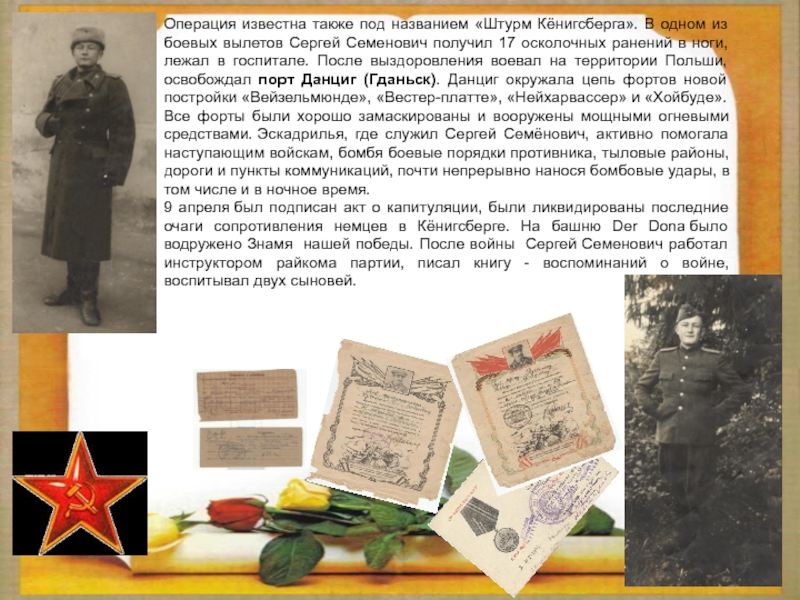 9 апреля был подписан акт о капитуляции, были ликвидированы последние очаги сопротивления немцев в Кёнигсберге. На башню Der Dona было водружено Знамя нашей победы. После войны Сергей Семенович работал инструктором райкома партии, писал книгу - воспоминаний о войне, воспитывал двух сыновей.