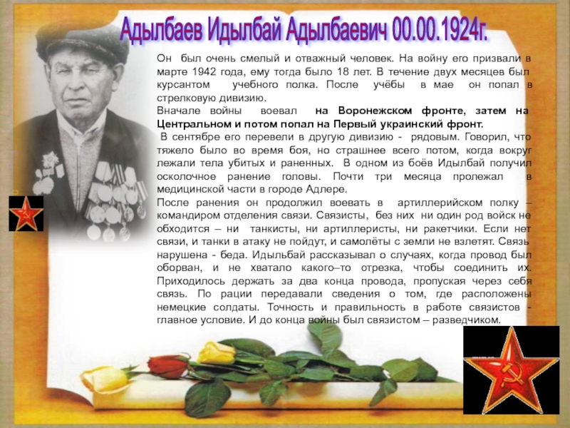 После ранения он продолжил воевать в артиллерийском полку – командиром отделения связи. Связисты, без них ни один род войск не обходится – ни танкисты, ни артиллеристы, ни ракетчики. Если нет связи, и танки в атаку не пойдут, и самолёты с земли не взлетят. Связь нарушена - беда. Идыльбай рассказывал о случаях, когда провод был оборван, и не хватало какого–то отрезка, чтобы соединить их. Приходилось держать за два конца провода, пропуская через себя связь. По рации передавали сведения о том, где расположены немецкие солдаты. Точность и правильность в работе связистов - главное условие. И до конца войны был связистом – разведчиком.