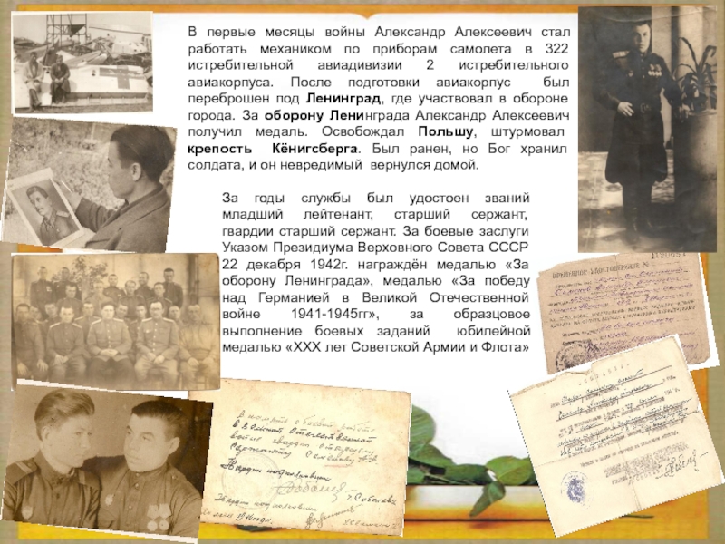 самолета в 322 истребительной авиадивизии 2 истребительного авиакорпуса. После подготовки авиакорпус был переброшен под Ленинград, где участвовал в обороне города. За оборону Ленинграда Александр Алексеевич получил медаль. Освобождал Польшу, штурмовал крепость Кёнигсберга. Был ранен, но Бог хранил солдата, и он невредимый вернулся домой.
