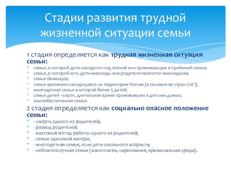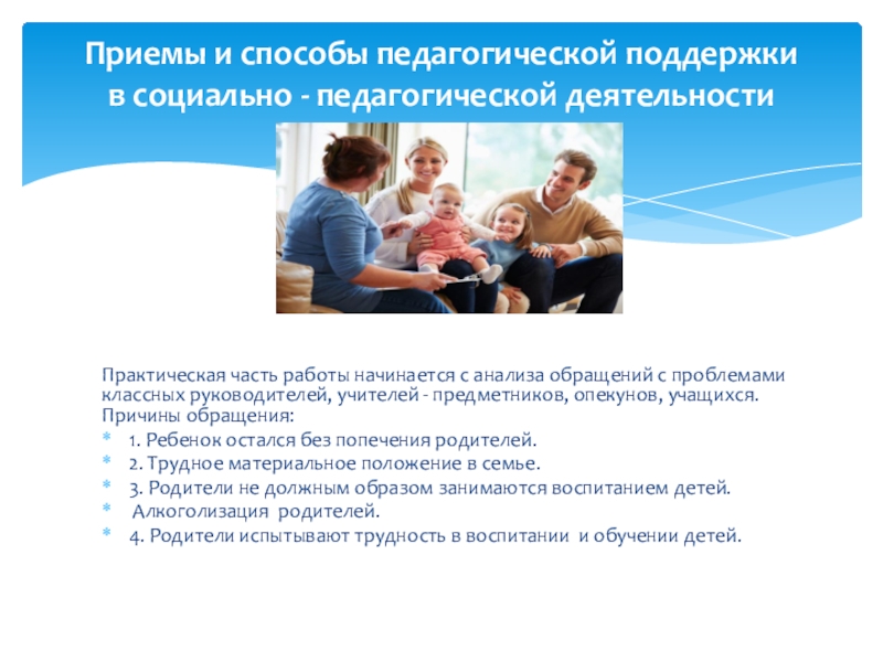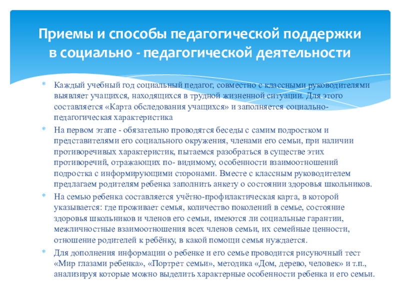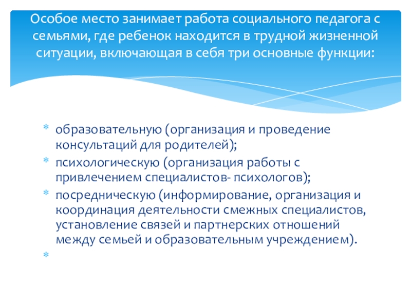 Особое место занимает работа социального педагога с семьями, где ребенок находится в трудной жизненной ситуации, включающая в себя три основные функции: