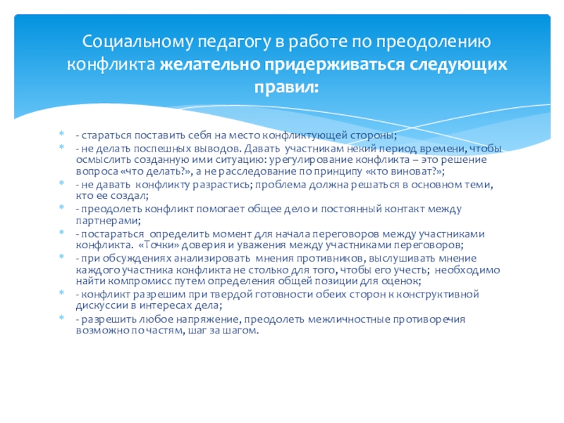 Социальному педагогу в работе по преодолению конфликта желательно придерживаться следующих правил: