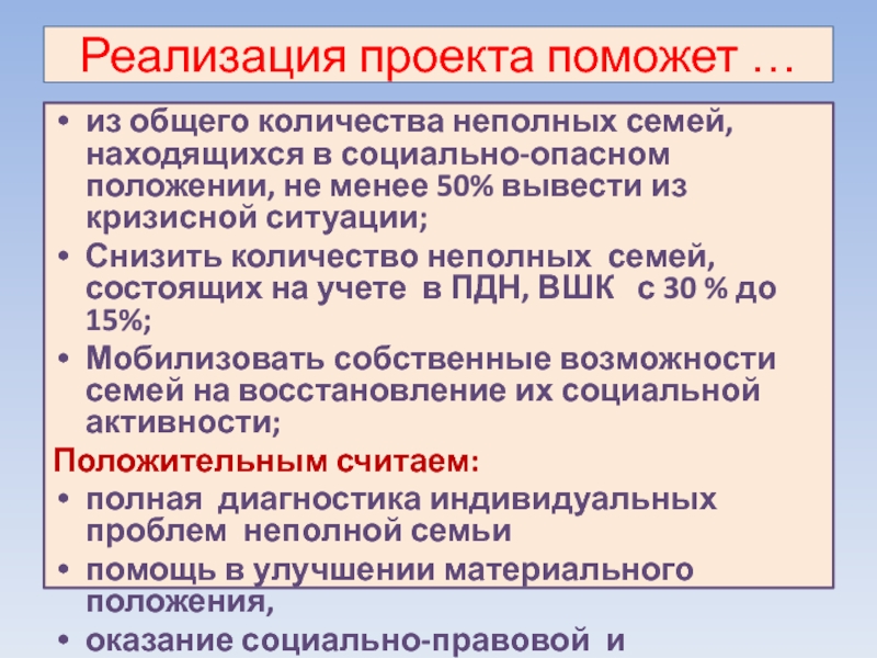 оказание психолого-педагогической помощи в рамках индивидуального психореабилитационного пространства для неполных семей.