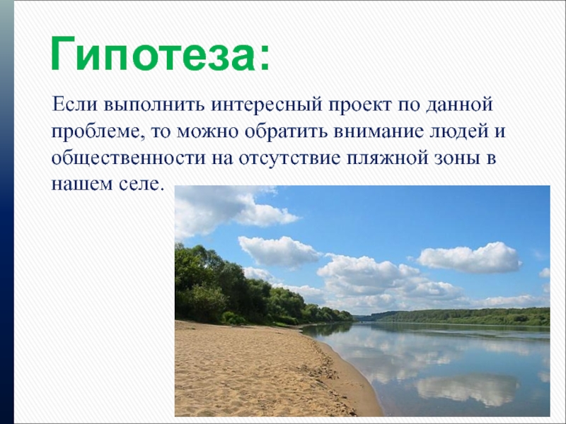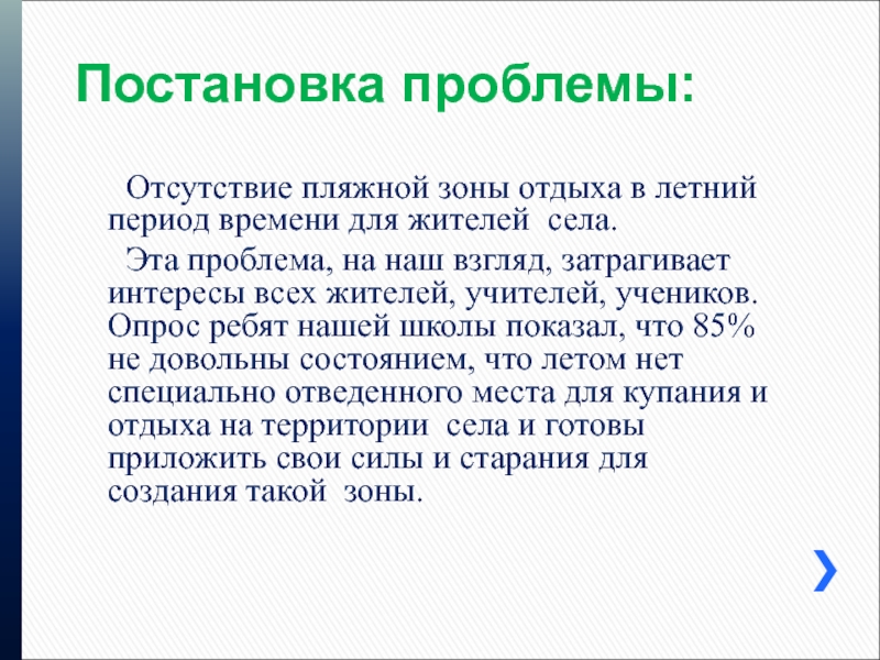 Эта проблема, на наш взгляд, затрагивает интересы всех жителей, учителей, учеников. Опрос ребят нашей школы показал, что 85% не довольны состоянием, что летом нет специально отведенного места для купания и отдыха на территории села и готовы приложить свои силы и старания для создания такой зоны.