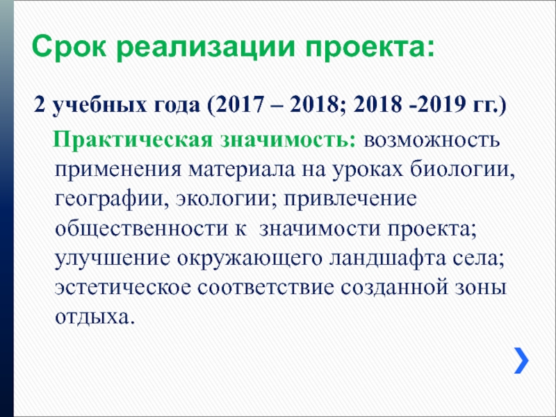 Практическая значимость: возможность применения материала на уроках биологии, географии, экологии; привлечение общественности к значимости проекта; улучшение окружающего ландшафта села; эстетическое соответствие созданной зоны отдыха.