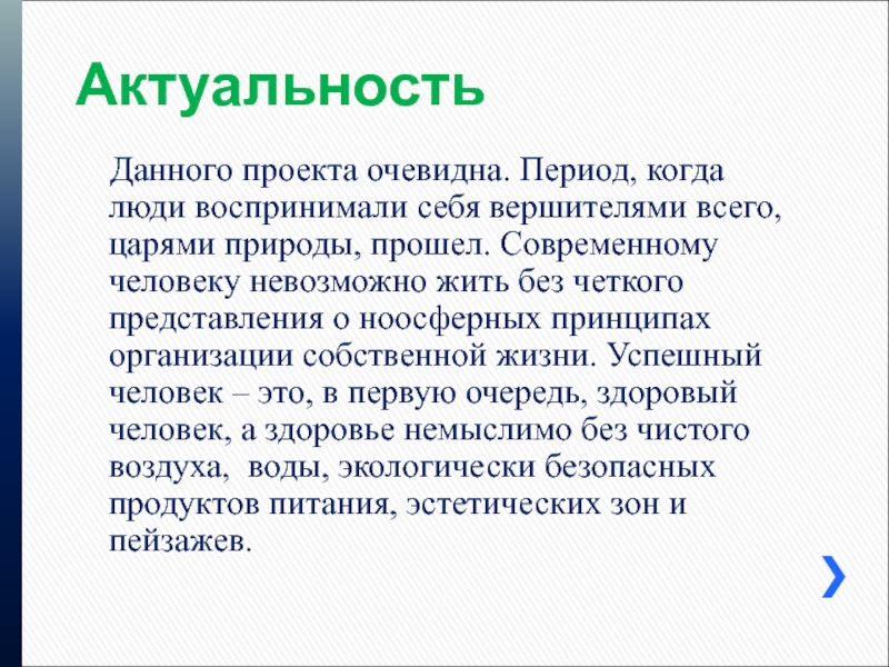 всего, царями природы, прошел. Современному человеку невозможно жить без четкого представления о ноосферных принципах организации собственной жизни. Успешный человек – это, в первую очередь, здоровый человек, а здоровье немыслимо без чистого воздуха, воды, экологически безопасных продуктов питания, эстетических зон и пейзажев.