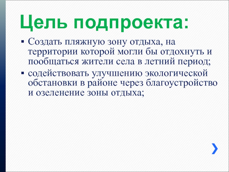Создание пляжной зоны отдыха и общения для школьников и жителей села в свободное время;