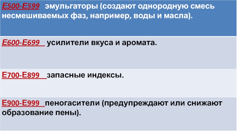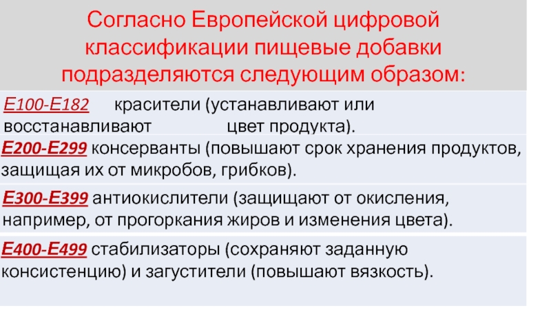 Слайд 14Согласно Европейской цифровой классификации пищевые добавки подразделяются следующим образом: