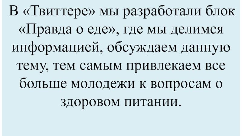 Слайд 26 В «Твиттере» мы разработали блок «Правда о еде», где мы