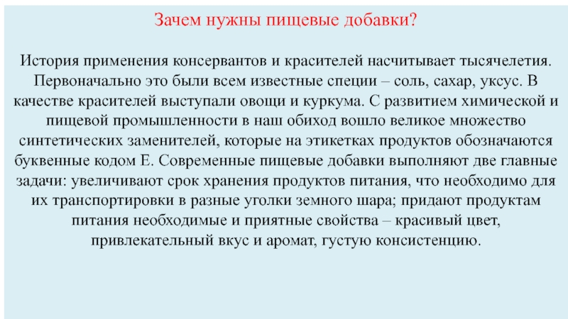 Первоначально это были всем известные специи – соль, сахар, уксус. В качестве красителей выступали овощи и куркума. С развитием химической и пищевой промышленности в наш обиход вошло великое множество синтетических заменителей, которые на этикетках продуктов обозначаются буквенные кодом Е. Современные пищевые добавки выполняют две главные задачи: увеличивают срок хранения продуктов питания, что необходимо для их транспортировки в разные уголки земного шара; придают продуктам питания необходимые и приятные свойства – красивый цвет, привлекательный вкус и аромат, густую консистенцию.