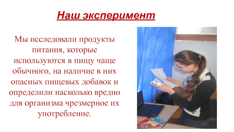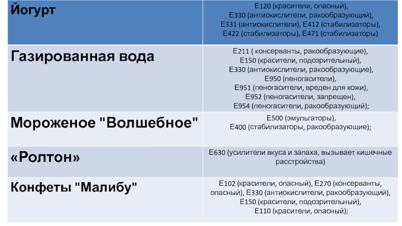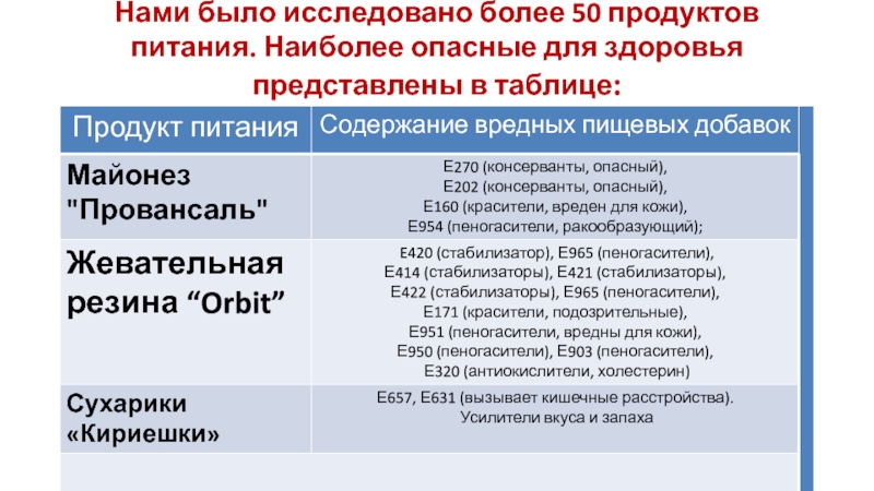 Слайд 18Нами было исследовано более 50 продуктов питания. Наиболее опасные для здоровья