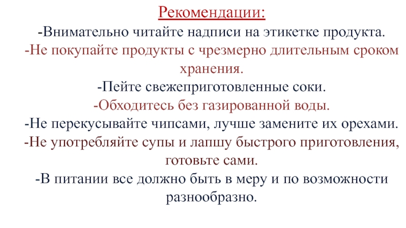 -Необходимо использовать в пищу натуральные продукты, овощи, фрукты, а не принимать полуфабрикаты и продукты быстрого приготовления, сразу готовые к употреблению.