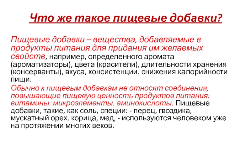 Обычно к пищевым добавкам не относят соединения, повышающие пищевую ценность продуктов питания: витамины. микроэлементы. аминокислоты. Пищевые добавки, такие, как соль, специи: - перец, гвоздика, мускатный орех. корица, мед, - используются человеком уже на протяжении многих веков.