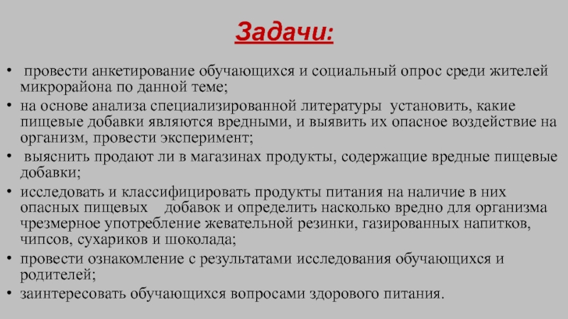 на основе анализа специализированной литературы установить, какие пищевые добавки являются вредными, и выявить их опасное воздействие на организм, провести эксперимент;