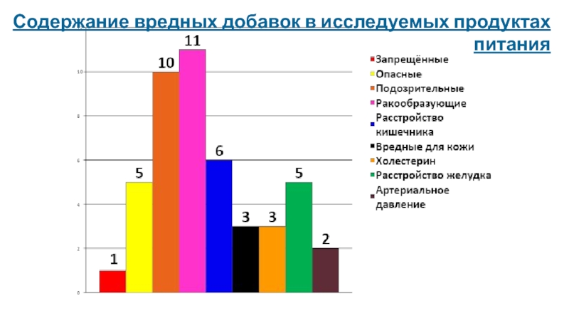 Слайд 20Содержание вредных добавок в исследуемых продуктах питания