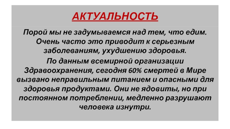 По данным всемирной организации Здравоохранения, сегодня 60% смертей в Мире вызвано неправильным питанием и опасными для здоровья продуктами. Они не ядовиты, но при постоянном потреблении, медленно разрушают человека изнутри.