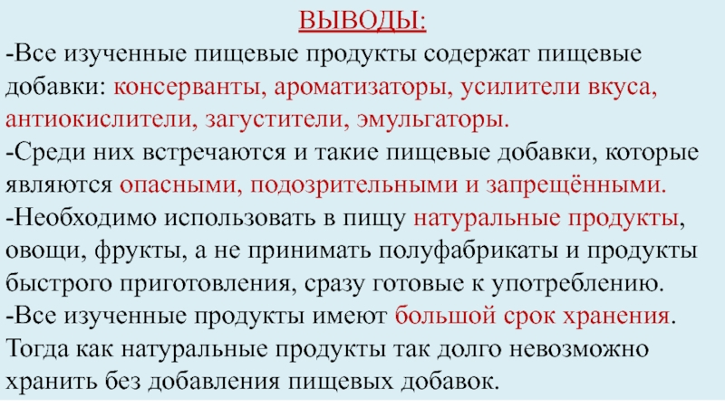 -Все изученные продукты имеют большой срок хранения. Тогда как натуральные продукты так долго невозможно хранить без добавления пищевых добавок.