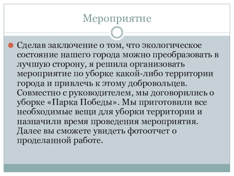 3)Организовать мероприятие, по устранению загрязнений антропогенного или естественного характера.
