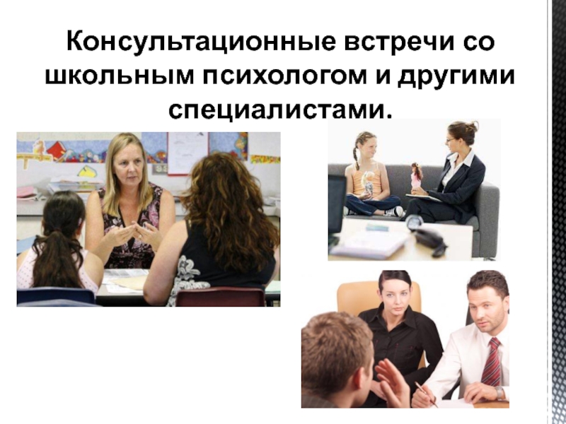 Слайд 13Консультационные встречи со школьным психологом и другими специалистами.