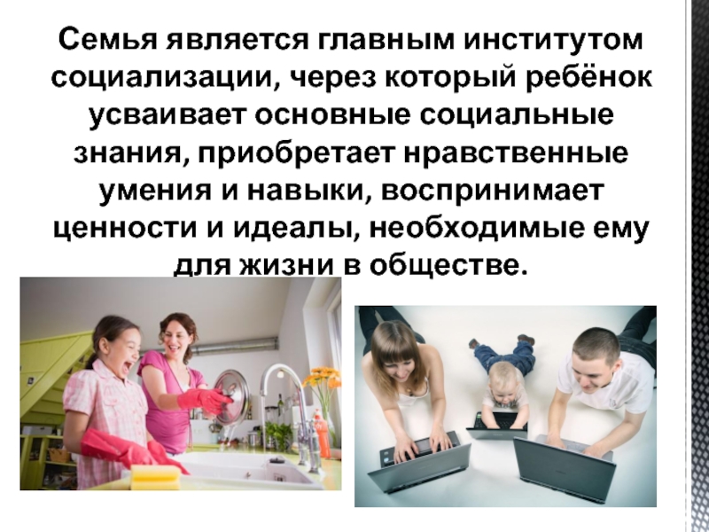 Семья является главным институтом социализации, через который ребёнок усваивает основные социальные знания, приобретает нравственные умения и навыки,