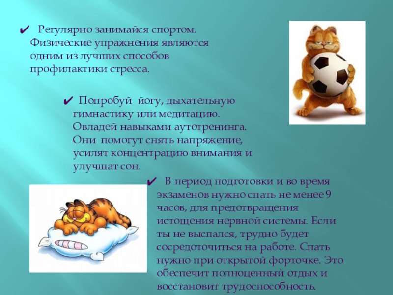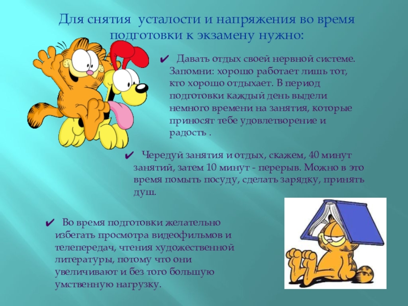 В период подготовки и во время экзаменов нужно спать не менее 9 часов, для предотвращения истощения нервной системы. Если ты не выспался, трудно будет сосредоточиться на работе. Спать нужно при открытой форточке. Это обеспечит полноценный отдых и восстановит трудоспособность.