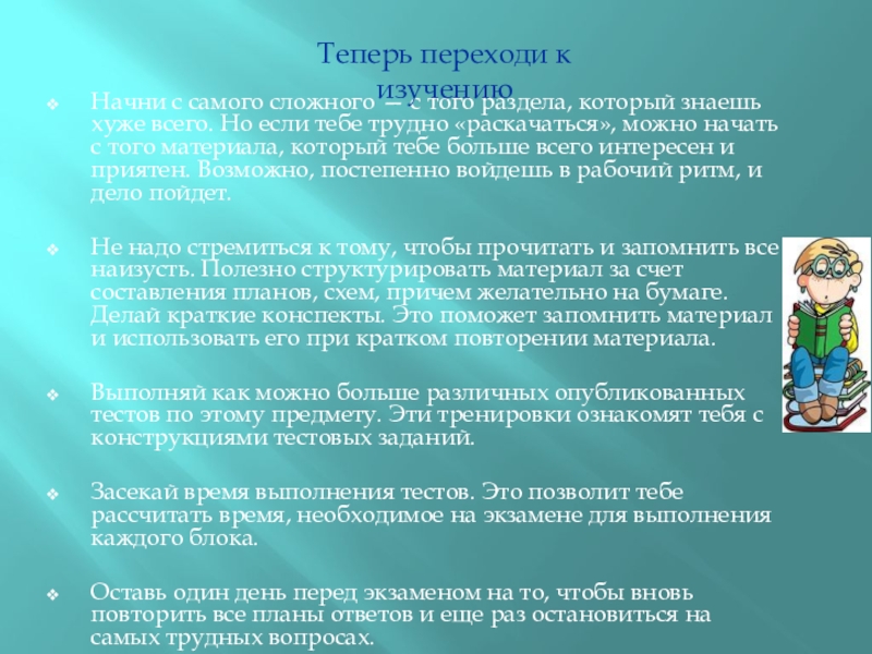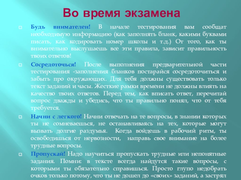 На экзамен нужно прийти точно в назначенное время. не опаздывая, но и не слишком рано, потому что ожидание более утомительно для нервной системы, чем сам экзамен, а спешка только увеличит твою тревожность. Поэтому приготовь все необходимое с вечера, а если остается время утром – прогуляйся на свежем воздухе и коротко повтори трудные моменты.