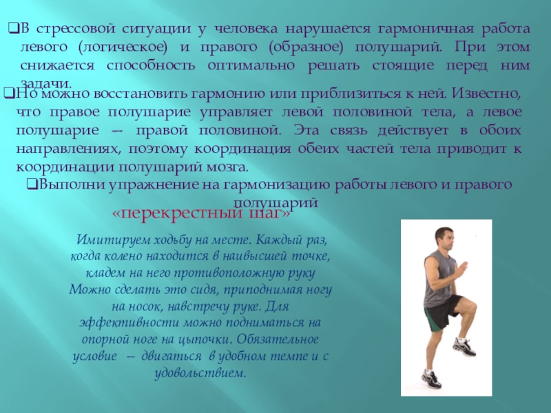 В стрессовой ситуации у человека нарушается гармоничная работа левого (логическое) и правого (образное) полушарий. При этом снижается способность оптимально решать стоящие перед ним задачи.