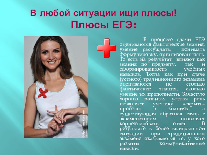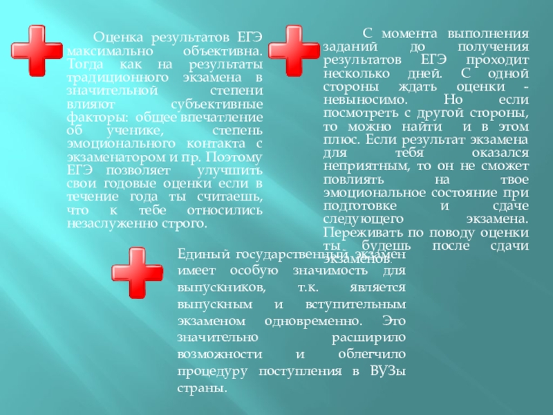 Оценка результатов ЕГЭ максимально объективна. Тогда как на результаты традиционного экзамена в значительной степени влияют субъективные факторы: общее впечатление об ученике, степень эмоционального контакта с экзаменатором и пр. Поэтому ЕГЭ позволяет улучшить свои годовые оценки если в течение года ты считаешь, что к тебе относились незаслуженно строго.