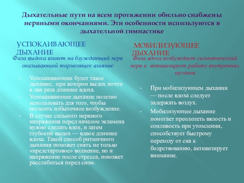 Успокаивающее дыхание полезно использовать для того, чтобы погасить избыточное возбуждение.
