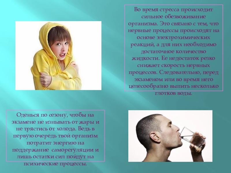Во время стресса происходит сильное обезвоживание организма. Это связано с тем, что нервные процессы происходят на основе электрохимических реакций, а для них необходимо достаточное количество жидкости. Ее недостаток резко снижает скорость нервных процессов. Следовательно, перед экзаменом или во время него целесообразно выпить несколько глотков воды.