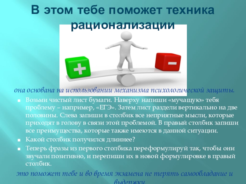 В случае сильного нервного напряжения перед началом экзамена нужно сделать вдох, и затем глубокий выдох — вдвое длиннее вдоха. Такой способ ритмичного дыхания поможет снять не только «предстартовое» волнение, но и напряжение после стресса, поможет расслабиться перед сном.