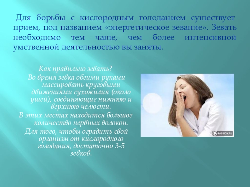 Для борьбы с кислородным голоданием существует прием, под названием «энергетическое зевание». Зевать необходимо тем чаще, чем более интенсивной умственной деятельностью вы заняты.