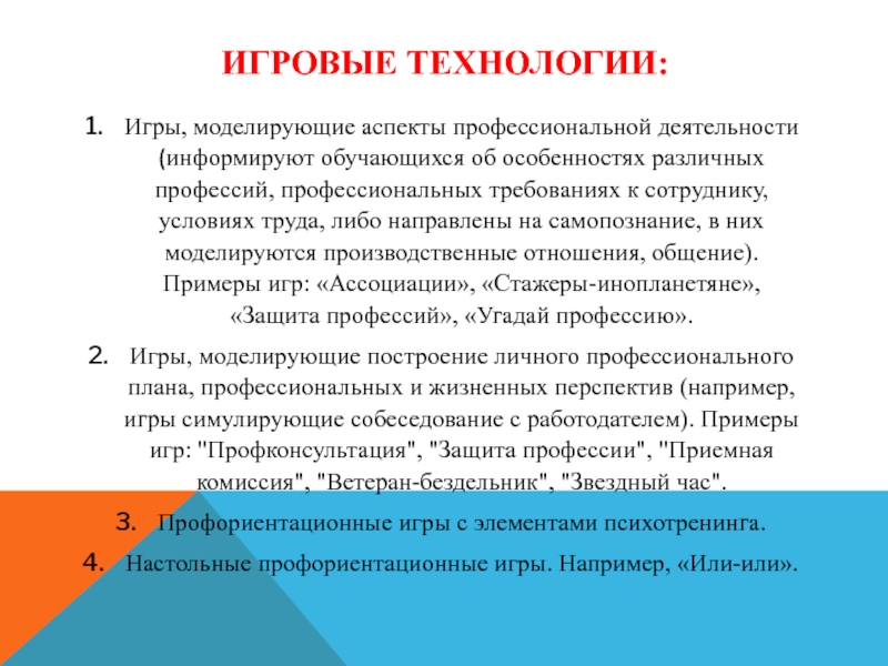 профессий, профессиональных требованиях к сотруднику, условиях труда, либо направлены на самопознание, в них моделируются производственные отношения, общение). Примеры игр: «Ассоциации», «Стажеры-инопланетяне», «Защита профессий», «Угадай профессию».