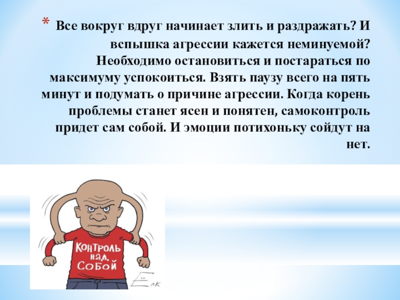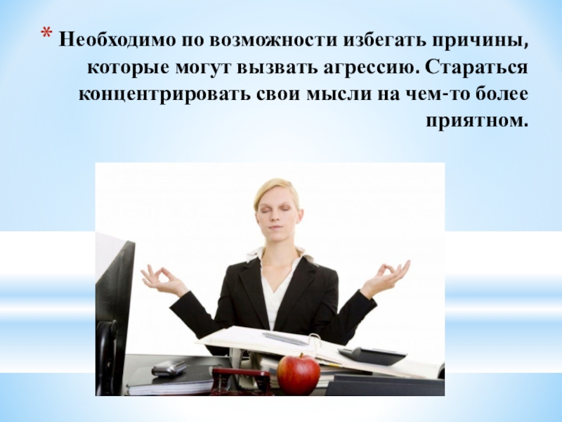 метод отказа от ситуации, которая может спровоцировать это состояние. Например, человек чувствует, что втягивается в спор, и все внутри постепенно начинает закипать. Чтобы этого избежать – надо отказаться от спора. Хорошо подумать – а стоит ли портить настроение и тратить свои время и нервы.