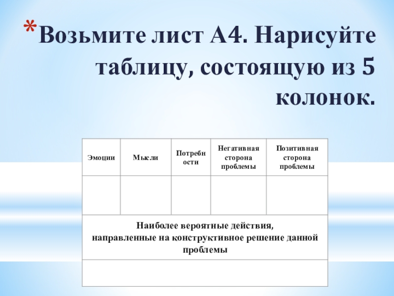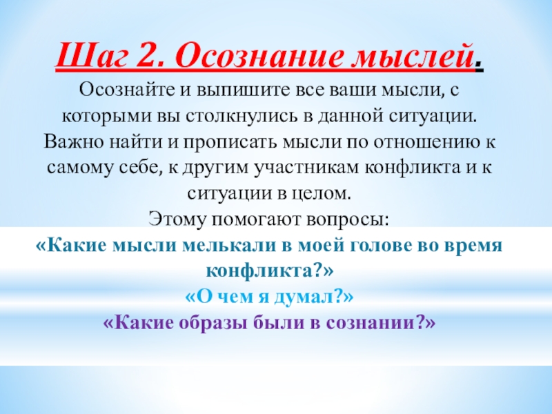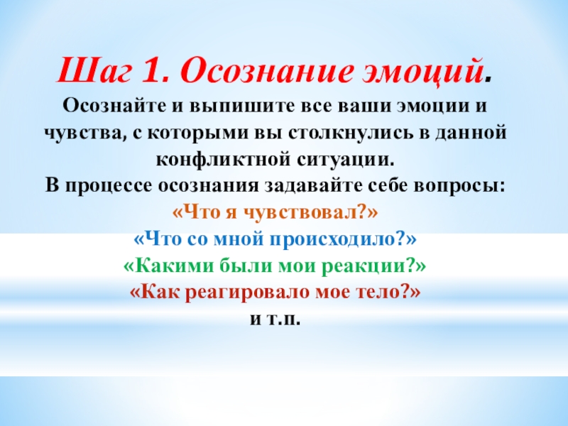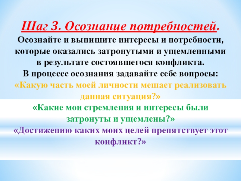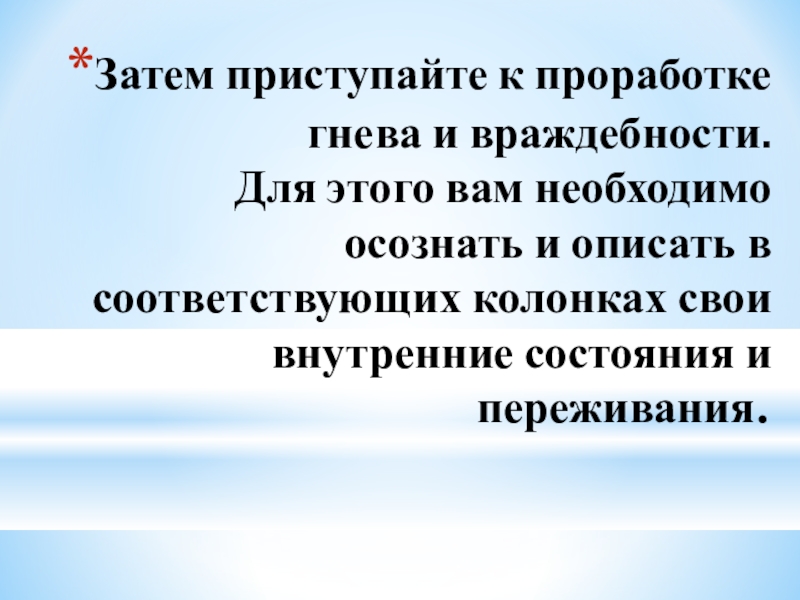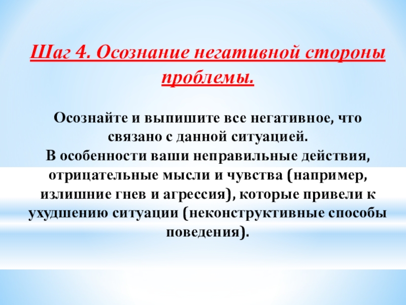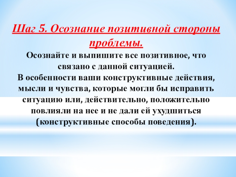 Когнитивной проработке враждебности, вербальной разрядке гнева, осознанию конфликтной ситуации и изменению отношения к ней хорошо способствует... Техника 5 шагов, которая позволяет позитивно переструктурировать проблему, выразить гнев и враждебность, проработать незавершенный конфликт.