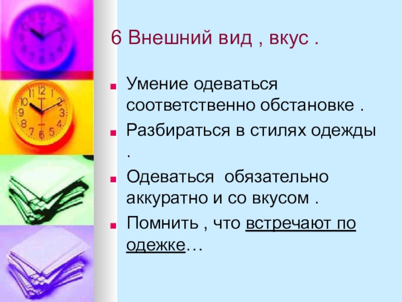 6 Внешний вид , вкус .Умение одеваться соответственно обстановке .Разбираться в стилях одежды .Одеваться обязательно аккуратно и