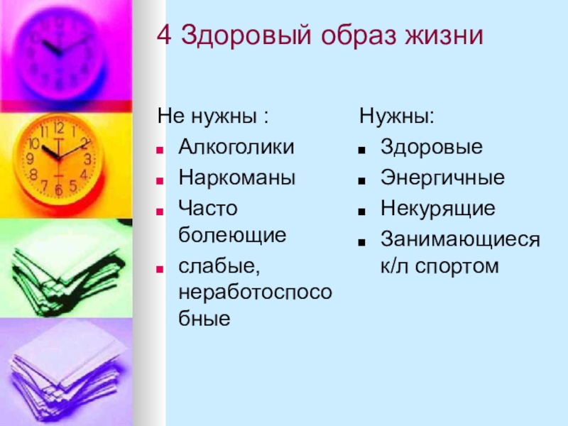 4 Здоровый образ жизниНе нужны :АлкоголикиНаркоманыЧасто болеющиеслабые, неработоспособныеНужны:ЗдоровыеЭнергичныеНекурящиеЗанимающиеся к/л спортом