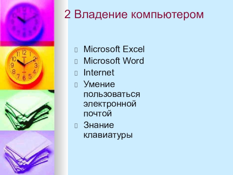 2 Владение компьютеромMicrosoft ExcelMicrosoft WordInternetУмение пользоваться электронной почтойЗнание клавиатуры