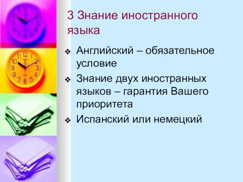 3 Знание иностранного языкаАнглийский – обязательное условиеЗнание двух иностранных языков – гарантия Вашего приоритета Испанский или немецкий