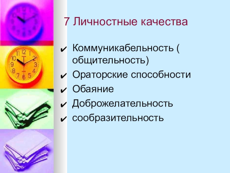 7 Личностные качестваКоммуникабельность ( общительность)Ораторские способностиОбаяниеДоброжелательностьсообразительность
