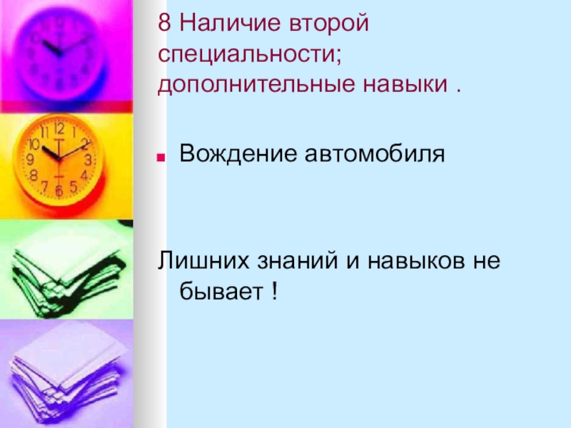 8 Наличие второй специальности; дополнительные навыки .Вождение автомобиляЛишних знаний и навыков не бывает !
