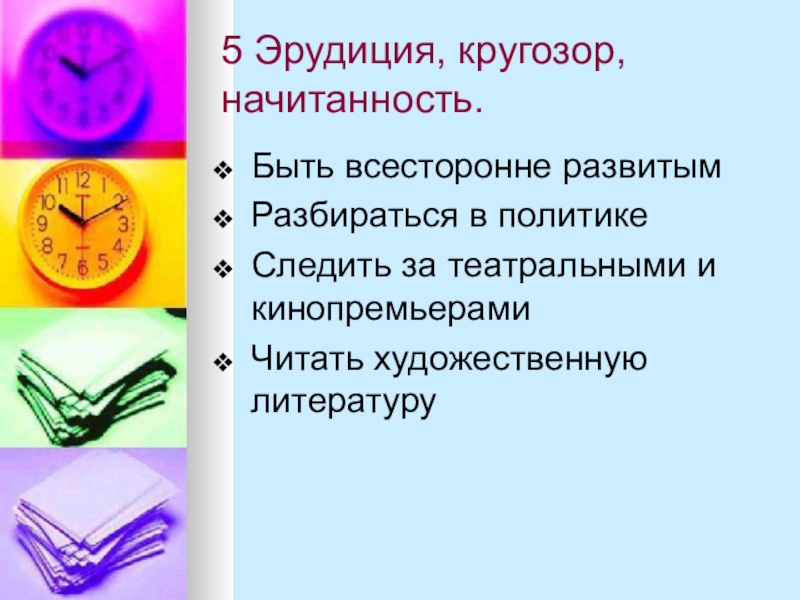 5 Эрудиция, кругозор, начитанность.Быть всесторонне развитымРазбираться в политикеСледить за театральными и кинопремьерамиЧитать художественную литературу