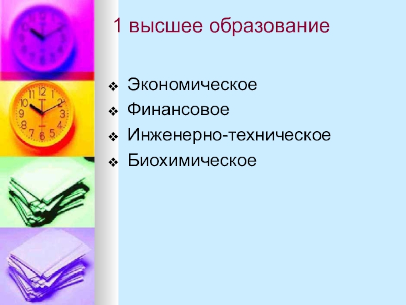 1 высшее образование ЭкономическоеФинансовоеИнженерно-техническоеБиохимическое