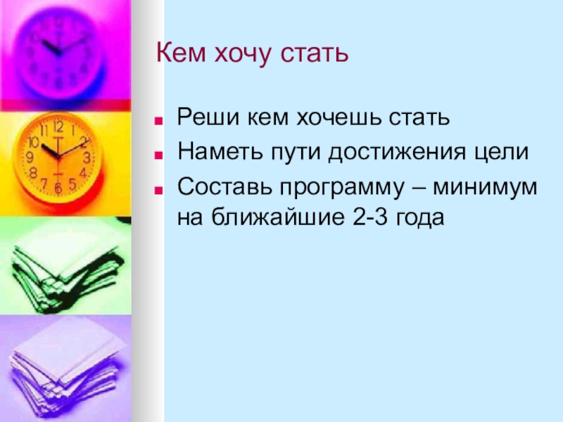 Кем хочу статьРеши кем хочешь статьНаметь пути достижения целиСоставь программу – минимум на ближайшие 2-3 года