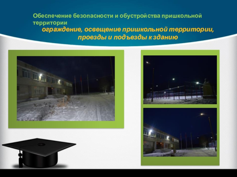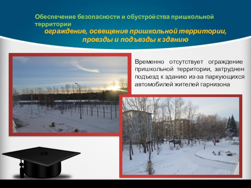 Временно отсутствует ограждение пришкольной территории, затруднен подъезд к зданию из-за паркующихся автомобилей жителей гарнизона