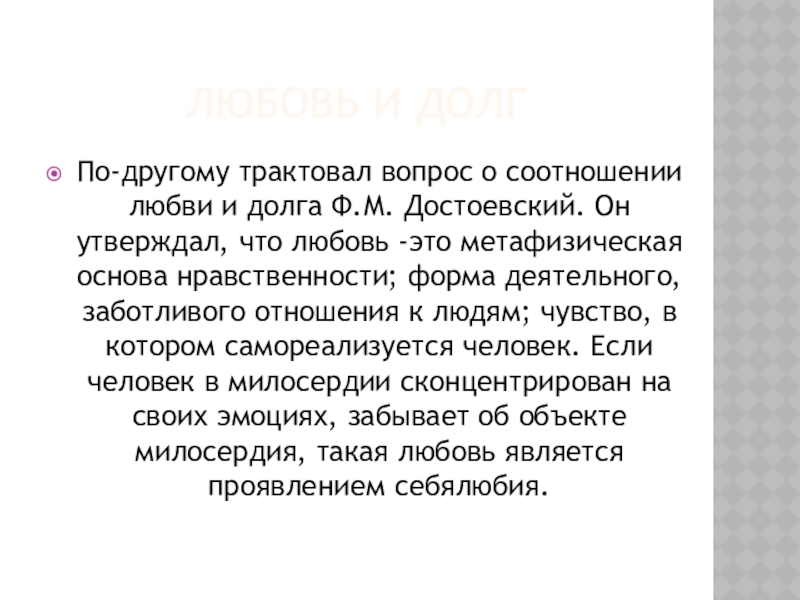 Ф.М. Достоевский. Он утверждал, что любовь -это метафизическая основа нравственности; форма деятельного, заботливого отношения к людям; чувство, в котором самореализуется человек. Если человек в милосердии сконцентрирован на своих эмоциях, забывает об объекте милосердия, такая любовь является проявлением себялюбия.