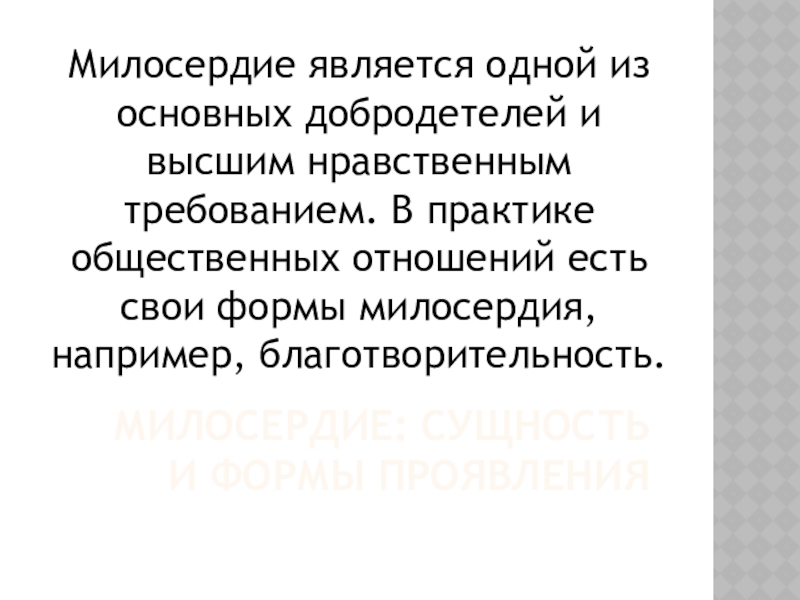 Слайд 11МИЛОСЕРДИЕ: СУЩНОСТЬ И ФОРМЫ ПРОЯВЛЕНИЯ