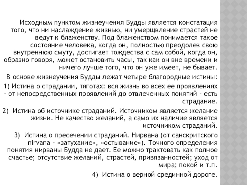 Исходным пунктом жизнеучения Будды является констатация того, что
