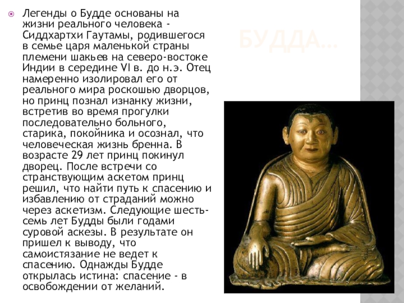 родившегося в семье царя маленькой страны племени шакьев на северо-востоке Индии в середине VI в. до н.э. Отец намеренно изолировал его от реального мира роскошью дворцов, но принц познал изнанку жизни, встретив во время прогулки последовательно больного, старика, покойника и осознал, что человеческая жизнь бренна. В возрасте 29 лет принц покинул дворец. После встречи со странствующим аскетом принц решил, что найти путь к спасению и избавлению от страданий можно через аскетизм. Следующие шесть-семь лет Будды были годами суровой аскезы. В результате он пришел к выводу, что самоистязание не ведет к спасению. Однажды Будде открылась истина: спасение - в освобождении от желаний.