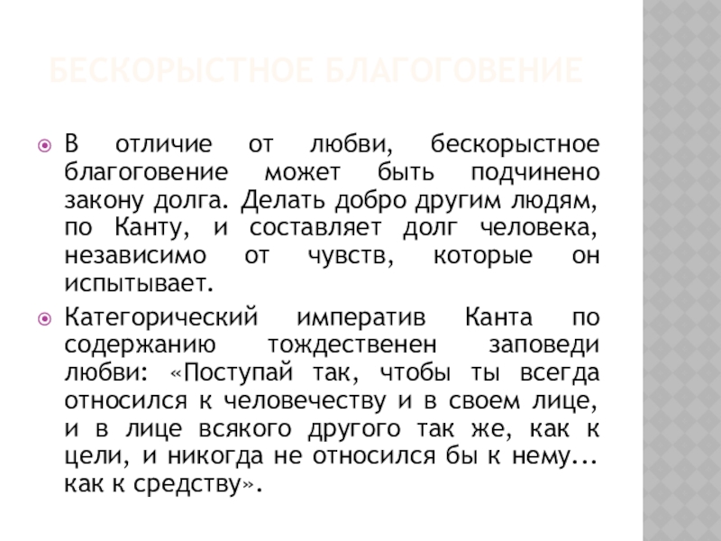 Последовательным критиком заповеди любви как основания, нравственности был Кант. Он утверждал: